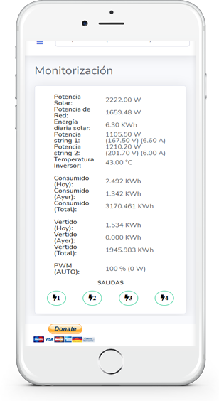 - Y por ultimo “AUTOMÁTICO / MANUAL” nos permite cambiar entre el modo automático, donde el derivador hace los ajustes automáticamente en función del excedente y el modo manual donde el derivador queda activado permanentemente con el porcentaje de salida que tengamos ajustado en el apartado “Porcentaje PWM en modo manual” que se puede ajustar en la pagina de “Salidas”, el único ajuste que hará será disminuir la potencia entregada por el dimmer en caso de estar cerca del máximo de la potencia contratada según lo configurado en el apartado correspondiente.